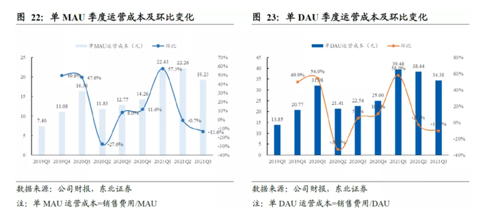 快手发展以短剧、体育等为核心的差异化垂类,用户规模和时长增长、单用户运营成本优化自2021年第三季度起效果显著,预计2021年四季度环比有望维持水平,叠加2022年第一季度冬奥会内容带动,预计2022年快手流量仍将稳健成长,DAU中长期4亿目标不变。