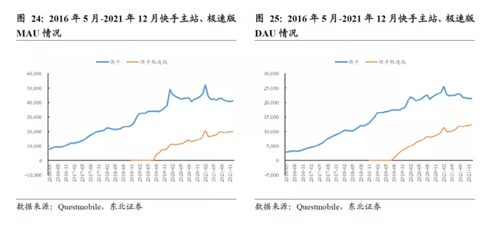 单从用户粘性方面来看,东北证券研报显示,2021年第四季度快手主站DAU/MAU为52.54%,较去年同期增长0.31%,极速版DAU/MAU为61.06%,较去年同期增长0.51%。总体来看,快手应用的用户粘性处于均稳中有升的状态。