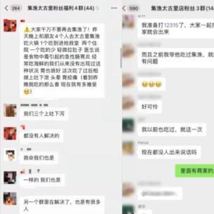 一段手机录屏显示,在一个名为“集渔太古里粉丝福利4群”的微信群聊内,不少成员在吐槽此事,该群最终被解散。