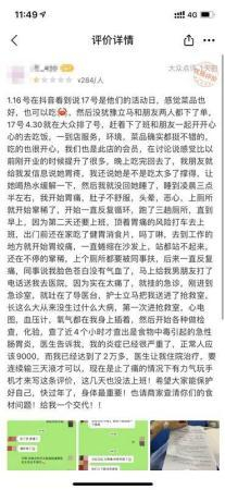 20日上午,闪电新闻记者在美团平台搜索该商家发现,评论区有多条留言在反映此事。一位网友留言称:1月16日通过抖音看到推广活动,称1月17日是商家会员活动日,见有优惠便在17日与朋友一同来到该店用餐。用餐后,当晚两人开始出现胃痛症状,第二天该网友便被送到医院抢救室,并被医生告知是食物中毒引发的急性肠胃炎。