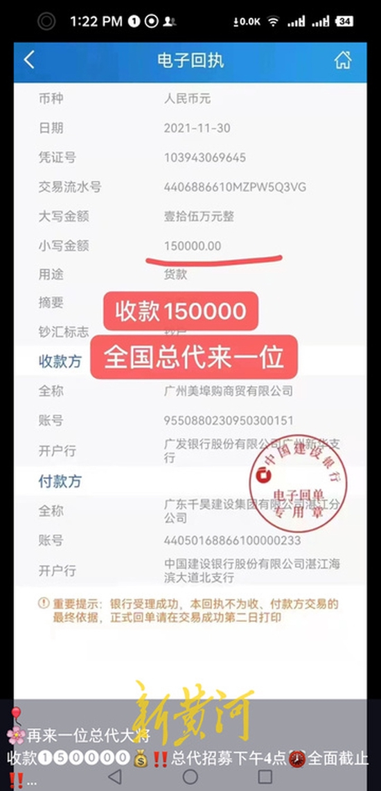 1月20日,新黄河记者网上搜索发现,“哔嗨啤”项目仍有人在从事招商活动。记者以了解项目为由,与一位自称思埠集团联合创始人的总代理刘总(化名)取得联系,刘总向记者介绍了“哔嗨啤”的销售模式,与上述资料显示基本一致,而且现在拿货价格更低,三种级别批发单价分别为75元、65元和55元。“现在公司下了新通知,已经暂时停止招收代理了,不过我可以给你单独申请,现在搞到一个代理名额很难。”过了一会儿,刘总表示已经通过公司申请,只需要给自己转账1000元,就能成为VIP代理。“VIP批发商和高级批发商代理费用,你转账给我就行,由我帮你转交给公司,只有总代的费用才直接转账给公司,这样方便公司进行管理。”为了打消记者的顾虑,刘总特意向记者展示了思埠集团盖章的“哔嗨啤”系列啤酒经营个人授权证书。