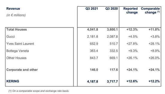 不过从实际财报来看,Gucci当前仍是集团的流量王和业绩担当。以第二担当圣罗兰为例,其在三季度营收为6.53亿欧元,虽然同比增速达到27.8%,但营收却不足GUCCI的三分之一。