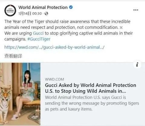 1月14日,国际性非营利动物保护组织“世界动物保护协会”在社交媒体上发文批评Gucci的虎年广告,称虎年应该让人们意识到要尊重和保护这些动物,而不是将它们“商品化”。该组织敦促Gucci停止在广告中“美化圈养野生动物”。