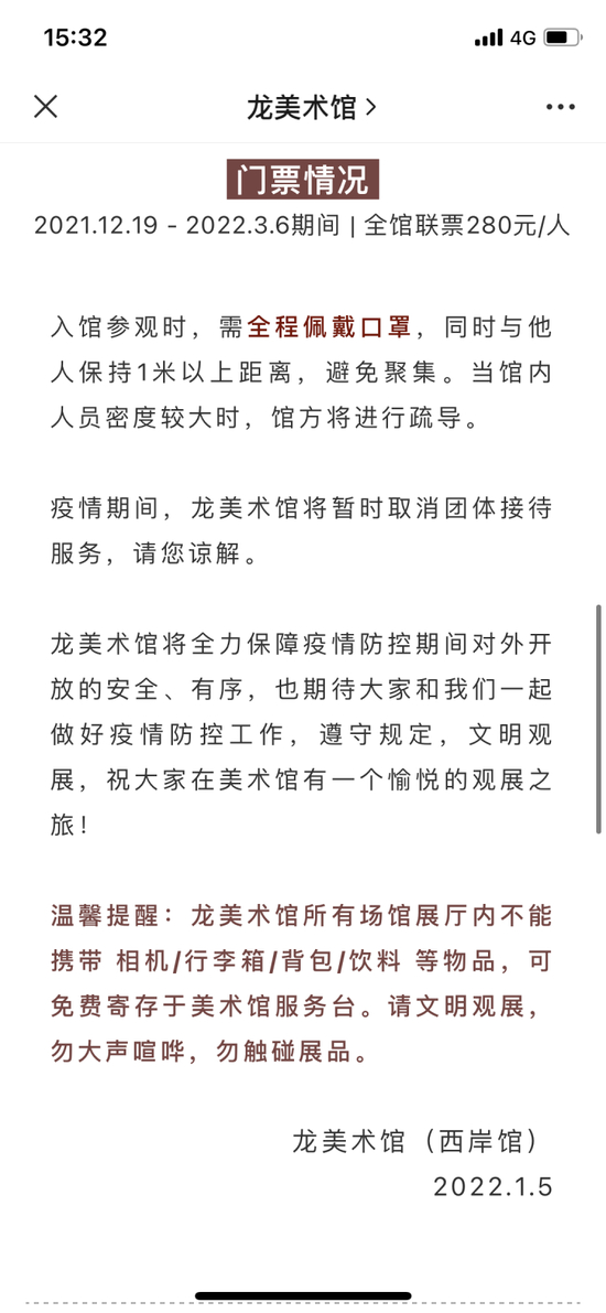 1月19日,记者在龙美术馆微信公众号上看到,其售票情况写明:2021年12月9日至2022年3月6日期间,全馆联票280元一人。