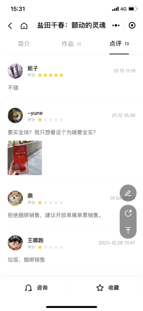 而在龙美术馆“颤动的灵魂”小程序界面,记者看到总共有13条点评,其中9条都是对套票的销售模式提出质疑,其中一位网友留言称:“拒绝捆绑销售,建议开放单展单票销售。”还有一位网友则表示:“其他展都看过了,如果只想看其中一个,还得买套票吗?”