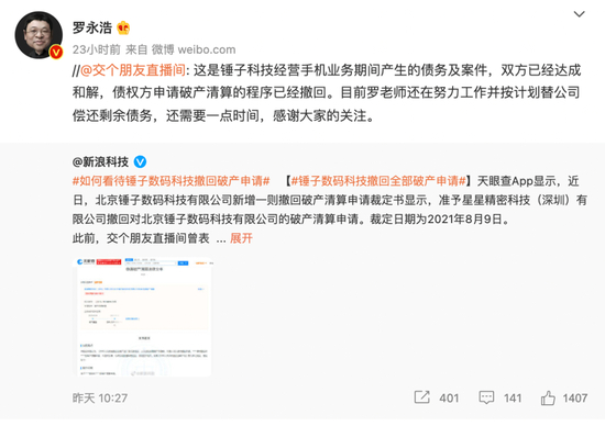 当天午间,交个朋友直播间发布微博回应称,这是锤子科技经营手机业务期间产生的债务及案件,双方已经达成和解,债权方申请破产清算的程序已经撤回。目前罗老师还在努力工作并按计划替公司偿还剩余债务,还需要一点时间,感谢大家的关注。
