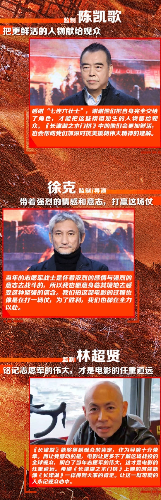 该片的宣传海报已做出调整,徐克是电影导演兼监制,陈凯歌与林超贤仅为监制。徐克表示,“当年的志愿军战士是怀着浓烈的感情与强烈的意志去战斗的,所以我也愿意身临其境地去感受这种坚强的信念。我们拍这部电影的过程也像是在打一场仗,为了胜利,我们也都在全力以赴。”