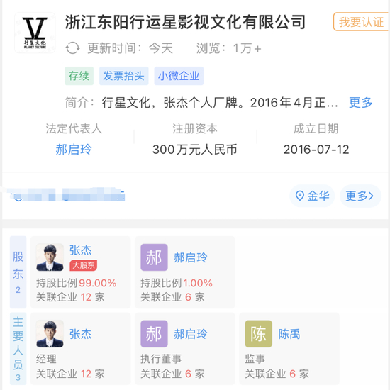 据企查查,浙江东阳行运星影视文化有限公司成立于2016年7月,注册资本300万元人民币。其中,张杰持股99%,郝启玲持股1%。