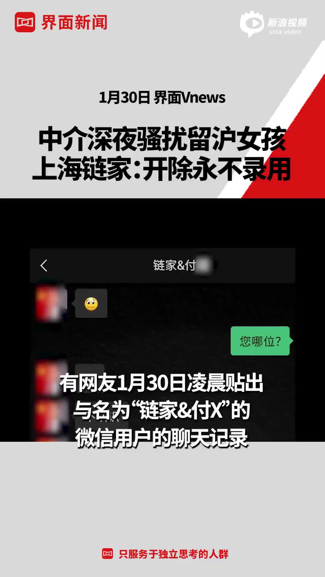 #中介深夜骚扰女孩#上海链家:开除永不录用】1月30日凌晨,有网友贴出与名为“链家&付X”的微信用户的聊天记录。记录显示付某言语污秽,称该网友并“不认识”自己,还威胁“我记得你”。今日事件在网上发酵,据称该网友因疫情独自留沪过年。界面新闻就此事询问上海链家,链家回复称:经查实该经纪人违反了公司红黄线管理规定,予以黑线(开除,永不录用)处理。对此,上海链家将加强对员工行为规范的宣导,避免此类事件再次发生。
