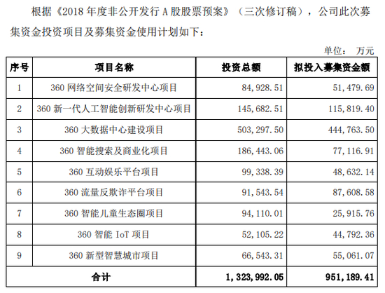 根据定增方案,公司此次募集资金投资项目包括360网络空间安全研发中心等9大项目,合计总投资额高达132亿元,其中募集资金拟投入95亿元。