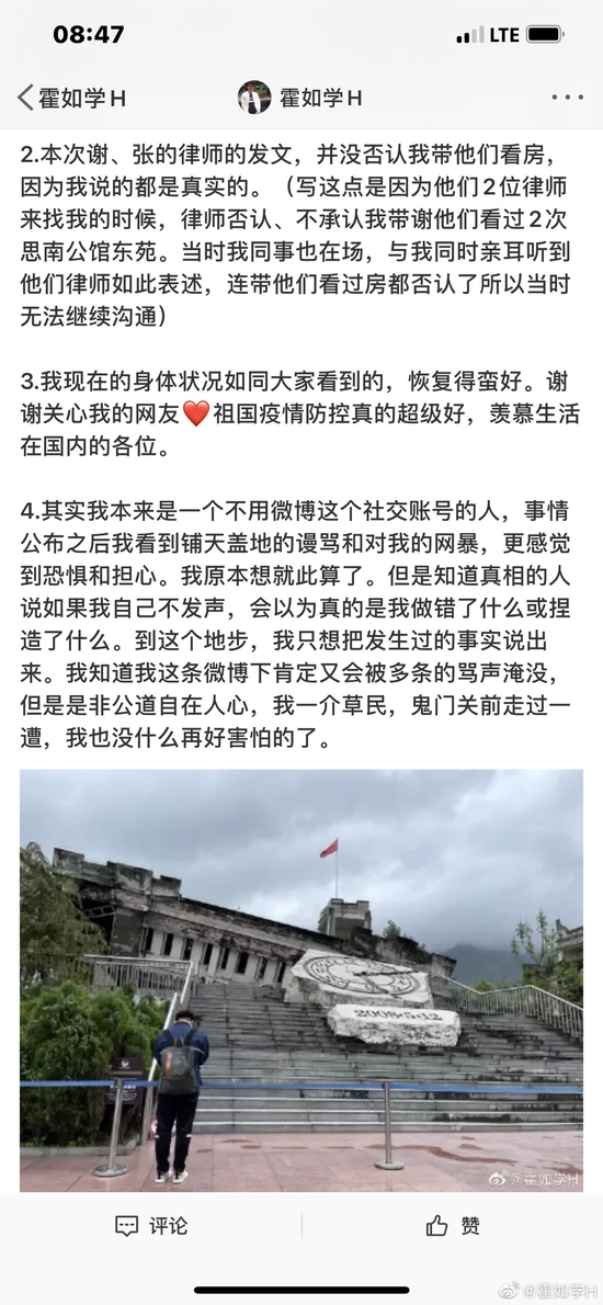 霍如学首先表示为了避免被张杰、谢娜二人的律师二次威胁,选择在海外读书,并在文中详细回答了网友关心的四个问题。