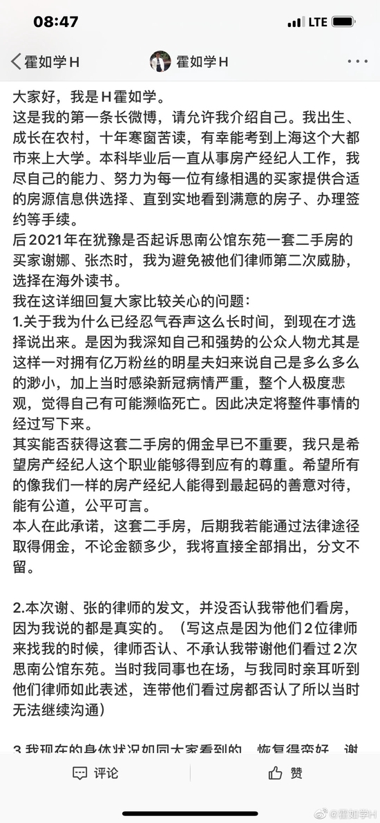 2月10日午间,谢娜张杰买房事件中介@霍如学H发布长微博。