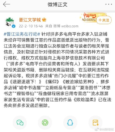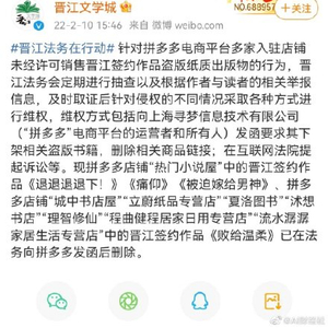 【#拼多多商家销售晋江文学盗版书#】2月10日,@晋江文学城 发文称,针对拼多多电商平台多家入驻店铺未经许可销售晋江签约作品盗版纸质出版物的行为,晋江法务会定期进行抽查以及根据作者与读者的相关举报信息,及时取证后针对侵权的不同情况采取各种方式进行维权,维权方式包括向上海寻梦信息技术有限公司(“拼多多”电商平台的运营者和所有人)发函要求其下架相关盗版书籍,删除相关商品链接;在互联网法院提起诉讼等。现部分书籍法务向拼多多发函后删除。