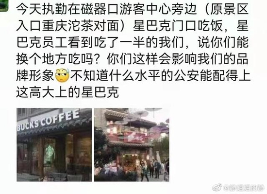 帖中发布的一张朋友圈截图内容显示为:“今天执勤在磁器口游客中心旁边(原景区入口重庆沱茶对面)星巴克门口吃饭,星巴克员工看到吃了一半的我们,说你们能换个地方吃吗?你们这样会影响我们的品牌形象。不知道什么水平的公安能配得上这高大上的星巴克”。