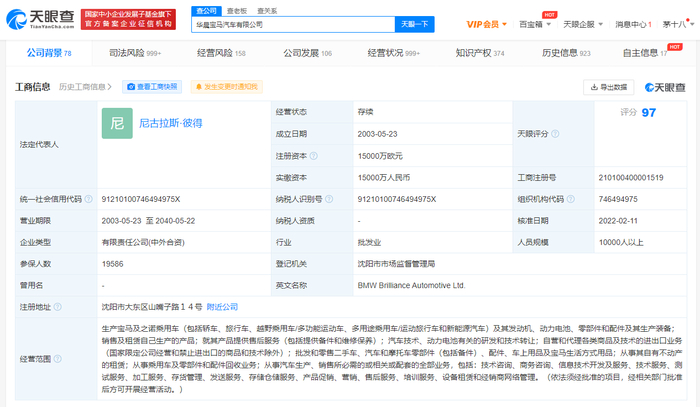 华晨宝马汽车有限公司成立于2003年5月,注册资本1.5亿欧元,经营范围含生产宝马及之诺乘用车等。日前,宝马集团发布消息称,自2月11日起,华晨宝马延长至2040年的新合资合同生效。根据新合同,宝马集团所持股份变更为75%。