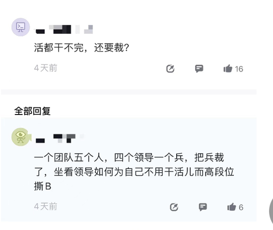 另一种说法是专门针对能力资历不强摸鱼的中层,“我们隔壁部门有两个中层领导去年底走的,不知是不是被裁的”。