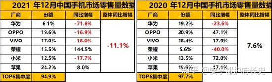 根据知乎用户“安乎都护府长史”统计的2021年12月中国手机市场零售量数据,小米排在苹果、OPPO、VIVO、荣耀之后,为12.5%,同比跌幅17.7%。