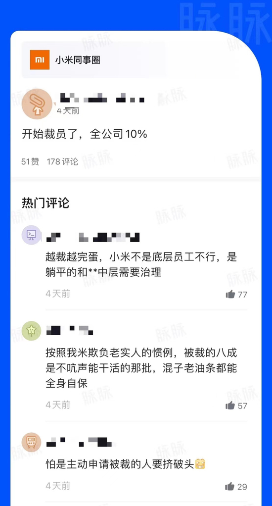 近日,有匿名网友提供了脉脉同事圈的截图:小米“开始裁员了,全公司10%”。