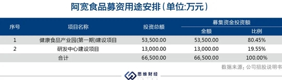 募资需求显示,阿宽食品本次IPO拟募资6.65亿元,其中5.35亿元用于健康食品产业园(第一期)建设项目、1.3亿元研发中心建设项目。两个项目所需要的资金在募资总额中的占比分别为80%和20%。