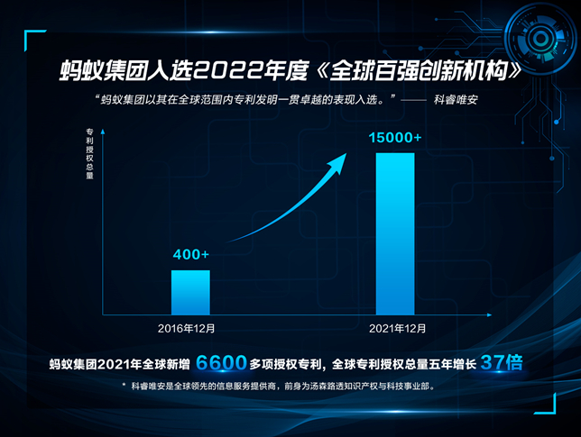榜单显示,2021年蚂蚁集团在全球共新增6600多项授权专利。除了区块链外,蚂蚁集团同时积极投入对安全计算、人工智能、物联网等前沿技术的创新研发。自2017年以来,蚂蚁集团持有的专利数量在不到五年的时间里增长了37倍,达到15000 多项。