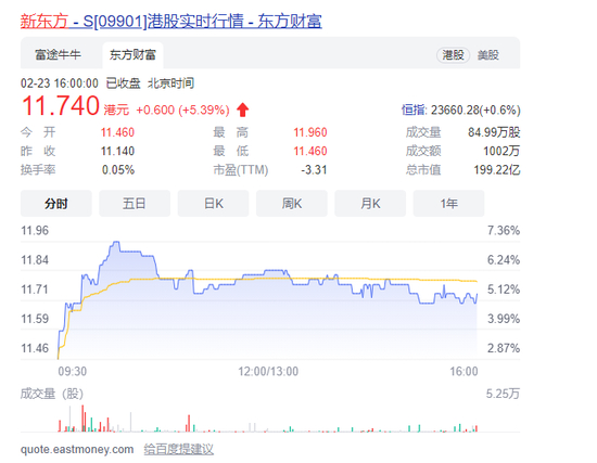 截至昨日收盘,新东方股价涨至11.740港元,较前日上涨5.39%。