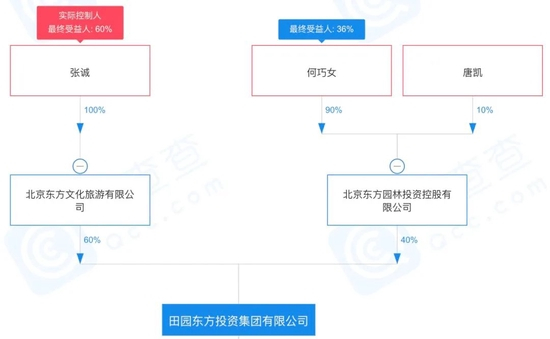 据乐居财经获悉,北京东方文化旅游有限公司和北京东方园林投资控股有限公司,分别持有田园东方60%和40%的股份。其中,大股东“北京东方文化旅游”由张诚全资持股;二股东“东方园林”则由何巧女和唐凯分别持股90%和10%。