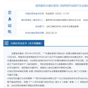 其中行政处罚决定书(杭运政罚〔2022〕11176)显示,主要违法事实为,2021年12月28日,杭州市交通运输局行政执法人员通过道路运输行业综合监管平台进行了取证:发现2021年12月28日,驾驶员孙继承驾驶浙AF05661在T3出行平台接单从事网约车经营业务中,存在车证不符的情况,执法人员查询***交通运输审批服务系统,未发现孙继承的浙AF05661车辆申请网约车经营许可的记录。2022年2月21日执法人员依法对赵知洲进行了询问并制作了《询问笔录》。依据《网络预约出租汽车经营服务管理暂行办法》第三十五条第(一)项的规定,杭州市交通运输局责令南京领行科技股份有限公司杭州分公司改正并罚款人民币壹(1)万元整。