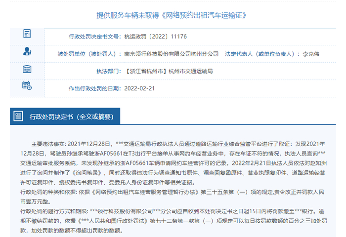 行政处罚决定书(杭运政罚〔2022〕11177)显示,主要违法事实为,2021年12月3日,杭州市交通运输局行政执法人员通过管理部门信息共享,发现2021年12月3日14时12分当事驾驶员郑盛腾驾驶浙AF88433通过T3出行平台接单,自浙大城市学院北校区载运1名乘客至***东站,至目的地时被杭州市交通运输局执法人员检查,检查时行程刚刚结束,驾驶员平台司机端显示该次运输收取运费31.94元。驾驶员郑盛腾现场无法出示网络预约出租汽车运输证,执法人员查询***交通运输审批服务系统,未发现浙AF88433轿车申请网约车经营许可记录。现场人员是郑盛腾。2022年2月21日执法人员依法对赵知洲进行了询问并制作了《询问笔录》。依据《网络预约出租汽车经营服务管理暂行办法》第三十五条第(一)项的规定,杭州市交通运输局责令南京领行科技股份有限公司杭州分公司改正并罚款人民币壹(1)万元整。