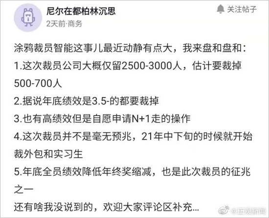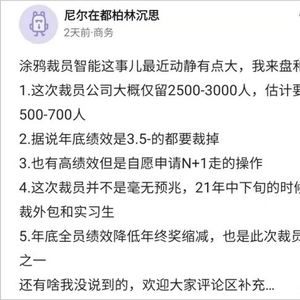 【涂鸦智能被曝裁员超700人 内部员工透露人员流失率高】2月24日消息,近日,有网友爆料涂鸦智能裁员500-700人,内容显示,涂鸦智能这次裁员公司大概仅留2500-3000人,估计要裁掉500-700人。另外,爆料者在脉脉上称,年底绩效是3.5-的都要裁掉;也有高绩效但是自愿申请N+1走的操作;这次裁员并不是毫无预兆,21年中下旬的时候就开始裁外包和实习生,年底全员绩效降低年终奖缩减,也是此次裁员的征兆之一。