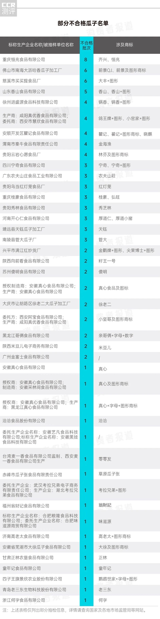 抽检结果显示,标称由重庆恒兆食品有限公司生产的瓜子不合格次数最多,高达8批次,涉及齐兴、恒兆等商标。