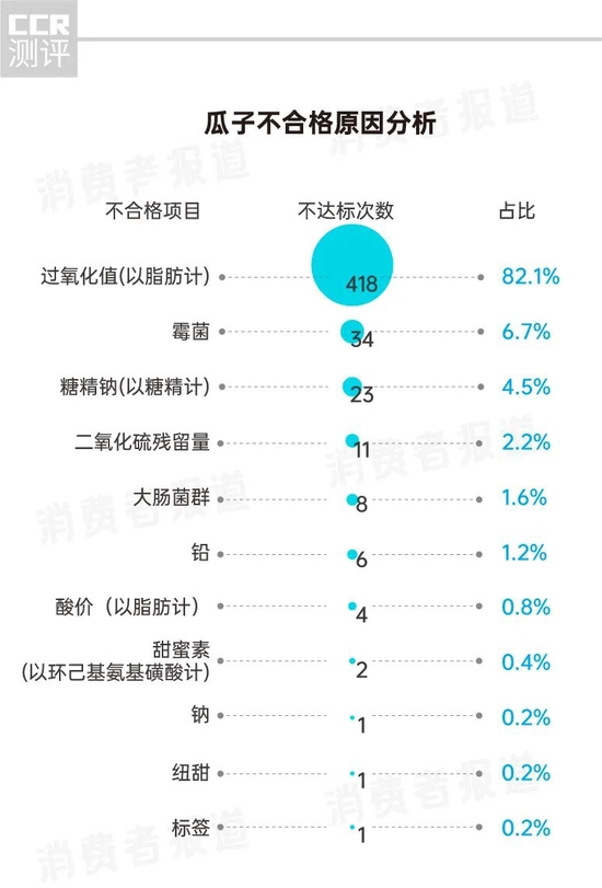 抽检结果显示,过氧化值占据不合格榜首,共有418批次瓜子因该项目超标上榜,占比高达82.1%,是瓜子不合格的主因。