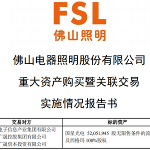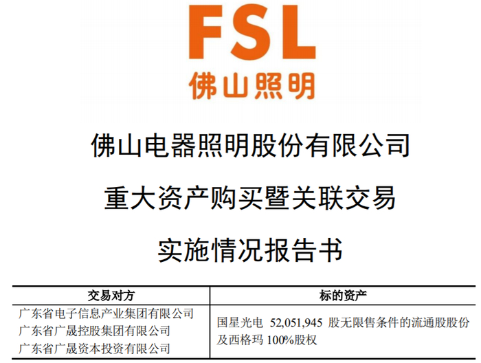 今日(2月25日)晚间,佛山电器照明股份有限公司(000541.SZ;以下简称佛山照明)发布《重大资产购买暨关联交易实施情况报告书》(以下简称《报告书》)。