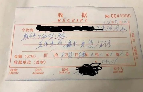 2021年3月份,因为卫生间墙面开裂,小思上58同城找人维修,被要价7900元。“整个过程我都是懵的,像个提线木偶一样付了钱,其实内心非常不开心,但似乎又没有什么办法。最后仅存的一点理智让我找他们要了一张收据。”