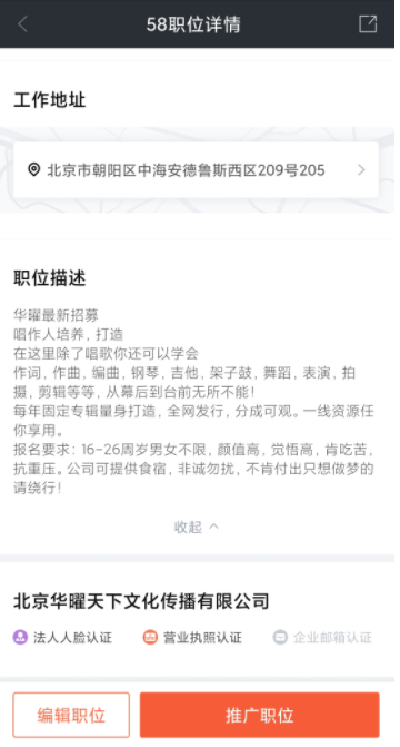 2月20日,又有网友因为虚假招聘黑猫投诉上发帖。这位网友2020年6月在58同城看到“北京华曜天下文化传播有限公司”招聘唱作人,应聘入职后,即被要求交培训费3.8万元,后续并无培训;还要求他工作,而没有发工资。