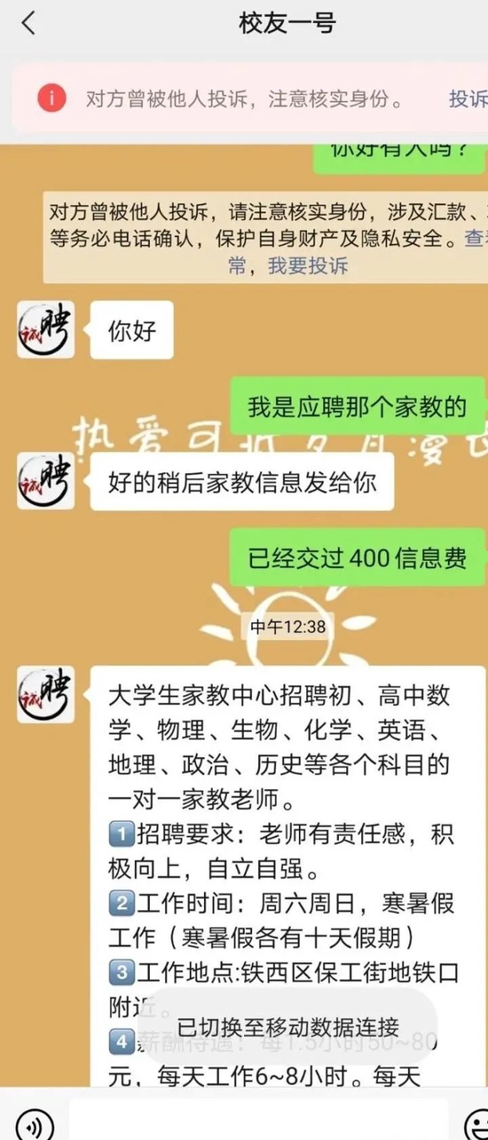 小白承认,当时他有赌的心理,毕竟对方表示当周末就有家教,1小时给150元,而且校区任选。支付完400元后,签了一份“看起来很扯的”协议。第二天,一个微信号曾被投诉的“客服”加了小白,给他发了家教信息,但他一打电话,发现是空号,根本无法联系,再追问客服信息,客服不再回复信息。