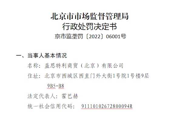 处罚决定书显示,经查,2008年至2020年期间,盖思特利商贸(北京)有限公司在全国(除港澳台地区,下同)已经开展销售业务的地域范围内与其交易相对人达成并实施限定价格的垄断协议,排除、限制市场竞争,损害消费者利益和社会公共利益。