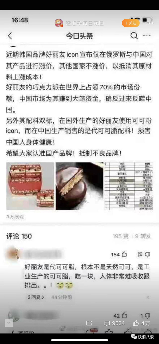 有消息称:“近期韩国品牌好丽友icon宣布仅在俄罗斯与中国对其产品进行涨价,其他国家不涨价,以抵消其原材料上涨成本!好丽友的巧克力派在世界上占领70%的市场份额,中国市场为其赚到大笔资金,确反过来反噬中国。另外其配料双标,在国外生产的好丽友使用可可粉icon,而在中国生产销售的是代可可脂配料!损害中国人身体健康!希望大家认准国产品牌!抵制不良品牌!”图中有网友称:“好丽友是代可可脂,根本不是天然可可,是工业生产的可可脂,吃一块,人体非常难吸收跟排出。”