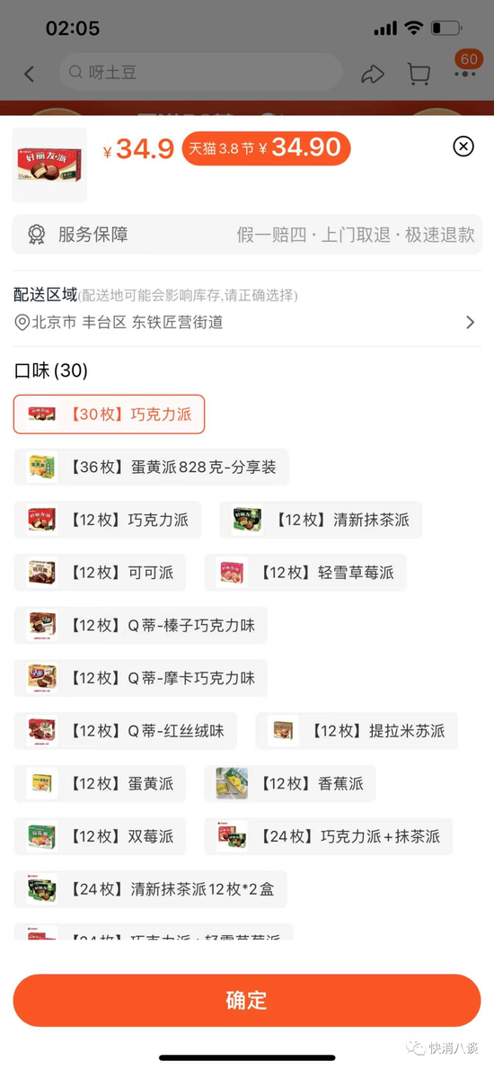 小八查询发现,在2021年8月的报道中提到,好丽友食品天猫旗舰店中出售的30枚装的巧克力派售价为33.9元。3月2日,小八查询发现,在该店铺出售的同规格巧克力派为34.9元。由此可见,该产品已涨价1元。