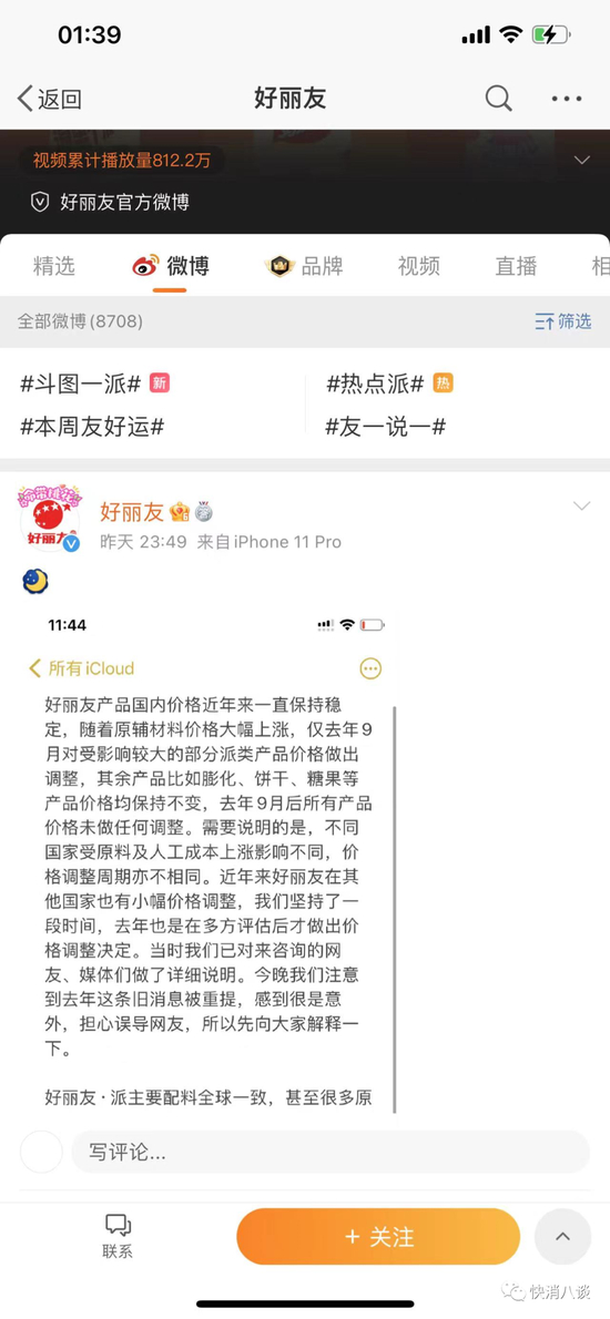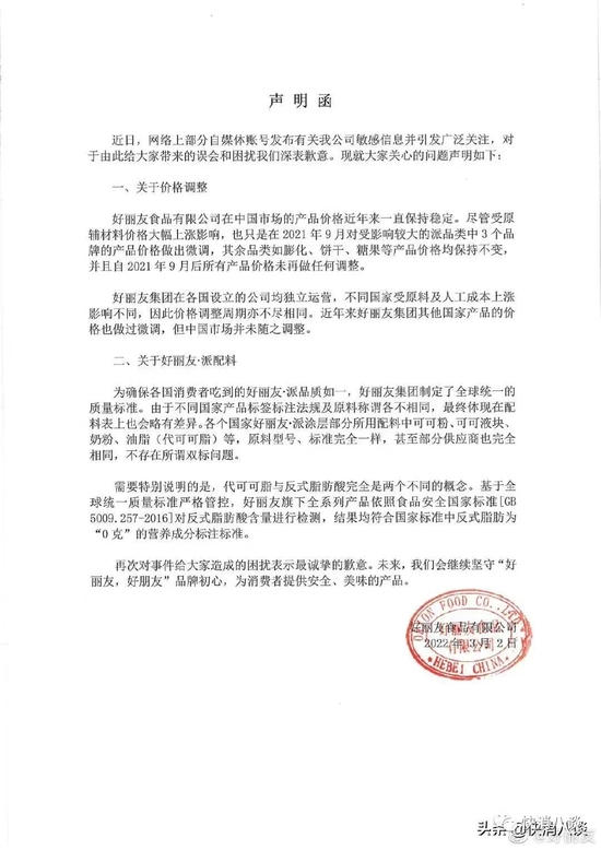 随后,好丽友官方通过微博发布消息:“好丽友产品国内价格近年来一直保持稳定,随着原辅材料价格大幅上涨,仅去年9月对受影响较大的部分派类产品价格做出调整,其余产品比如膨化、饼干、糖果等产品价格均保持不变,去年9月后所有产品价格未做任何调整。需要说明的是,不同国家受原料及人工成本上涨影响不同,价格调整周期亦不相同。近年来好丽友在其他国家也有小幅价格调整,我们坚持了一段时间,去年也是在多方评估后才做出价格调整决定。当时我们已对来咨询的网友、媒体们做了详细说明。今晚我们注意到去年这条旧消息被重提,感到很是意外,担心误导网友,所以先向大家解释一下。”