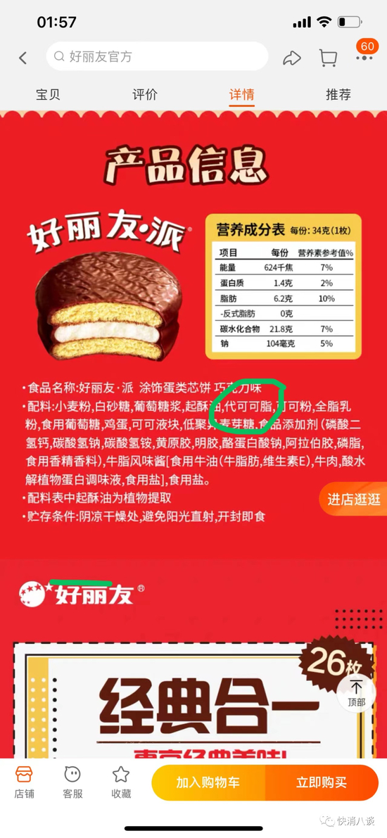 小八查询好丽友天猫旗舰店看到,在好丽友·派的配料表中,除了使用可可粉、可可液块等,也明确标明了含有代可可脂。对此,小八咨询了好丽友客服,但由于客服未在工作时间内,对此尚未予以回复。