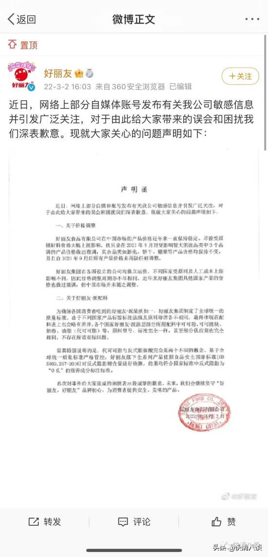 3月2日,针对近日网络上部分自媒体账号发布有关好丽友涨价与原料“双标”等问题,好丽友通过官方微博再次发布正式声明称:“好丽友食品有限公司在中国市场的产品价格近年来一直保持稳定。尽管受原辅材料价格大幅上涨影响,也只是在2021年9月对受影响较大的派品类中3个品牌的产品价格做出微调,其余品类如膨化、饼干、糖果等产品价格均保持不变,并且自2021年9月后所有产品价格未再做任何调整。好丽友集团在各国设立的公司均独立运营,不同国家受原料及人工成本上涨影响不同,因此价格调整周期亦不尽相同。近年来好丽友集团其他国家产品的价格也做过微调,但中国市场并未随之调整。”