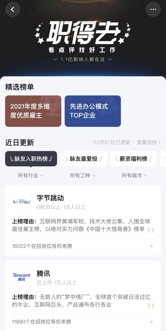 此外,脉脉还上线了“职得去”榜单,在脉友入职热榜、薪资福利榜、名校生最爱去、最无年龄焦虑公司等标签下,评选出数个公司。红星资本局发现,字节跳动、腾讯(腾讯控股00700.HK)、阿里巴巴(09988.HK)等互联网大厂均“榜上有名”。