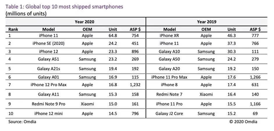 根据Omdia数据,第一代iPhone SE在2016年录得2110万部出货量,平均售价为454美元。第二代iPhone SE在2020年出货量为2420万部,平均售价为451美元,是当年全球前十榜单中iPhone机型价格最低的。