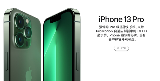 苹果推出了iPhone 13系列的新配色。iPhone 13 mini、iPhone 13为绿色版,iPhone 13 Pro、iPhone 13 Pro Max为苍岭绿色。
