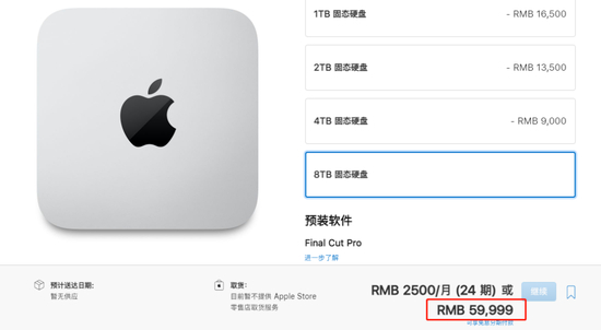 另外还有选配项,顶配20核中央处理器、64核图形处理器、32核神经网络引擎、128GB统一内存、8TB固态硬盘,售价5999元。如果升级到顶配的M1 Ultra(64核GPU)/128GB/8TB,价格为59999元。
