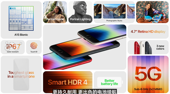 对更多的普通消费者来说,手机和平板最受关注。和外界预料的一样,这次发布会带来两款手机,一个是支持5G的第三代iPhone SE,另一个是新配色版的iPhone 13。平板方面,带来了新的iPad Air。