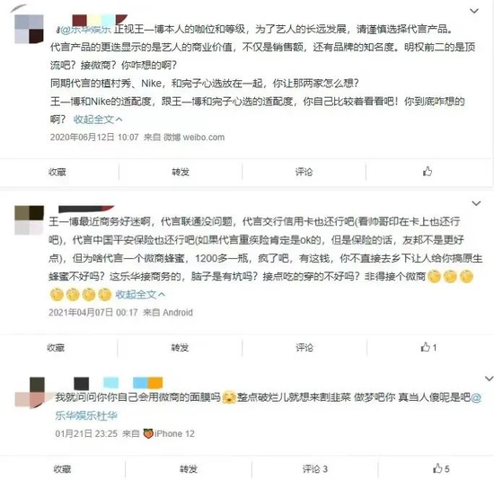 虽然从客观来看,粉丝对于偶像的业务能力要求那么高,但终究是期待看到在舞台上闪闪发光的偶像,而不是在直播间努力卖货的销售员。商业代言本来是艺人影响力的重要兑现途径,但在如今的环境下却变成了赤裸裸的割粉丝韭菜行为。2021年不少乐华艺人接到不知名品牌代言,粉丝曾吐槽乐华为赚钱不断给艺人接微商品牌代言。