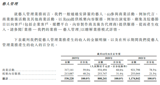 艺人管理下主要有两类收入,一类是参与商业活动,例如代言、推广;另一类则是提供娱乐内容服务,也就是出演电影、电视剧、综艺节目等。前者在这项收入中的比重从2019年的59.8%增加到了2021年的78.5%。可见乐华家的艺人赚钱主要还是靠代言和商业推广,这也印证了外界关于偶像的另一则刻板印象“偶像没有作品,都在割粉丝韭菜”。