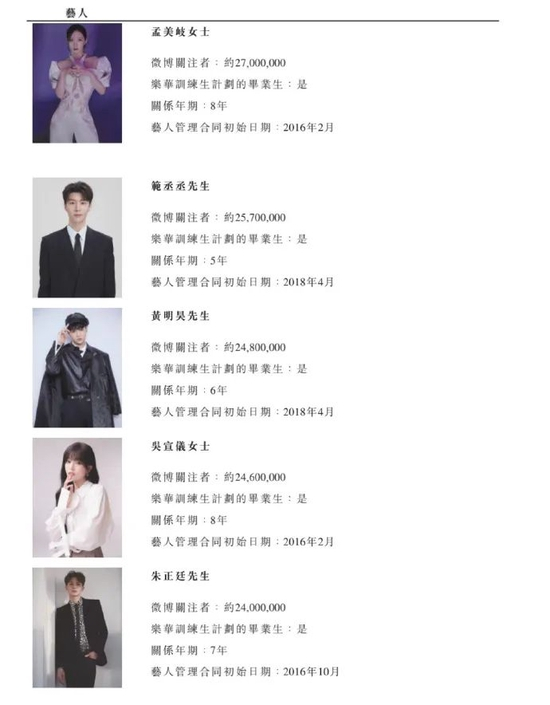 娱乐圈讲究番位,乐华招股书中公司内部艺人番位也一览无遗。