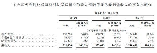 和其他影视公司内容制作、艺人经纪两手抓不同,乐华的主要业务都以艺人经纪为核心,分别是艺人管理、音乐IP制作和运营、泛娱乐业务。其中最重要的业务为艺人管理,从2019年到2021年,这一板块对营收的贡献占比从84%上升到91%。